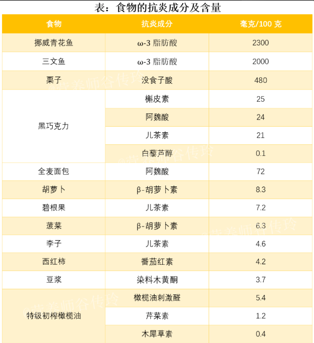 抗炎飲食可以改善體內的炎癥因子,避免發(fā)展出疾病。比如:碳水化合物:推薦全谷物碳水化合物,比如藜麥、糙米、蕎麥、黑米等等。脂肪:多選擇單不飽和脂肪酸和多不飽和脂肪酸,比如魚(yú)蝦、貝類(lèi)、亞麻籽油等含有多不飽和脂肪酸、歐米伽-3型脂肪酸。蛋白質(zhì):選優(yōu)質(zhì)蛋白質(zhì),如魚(yú)、家禽、雞蛋、瘦紅肉,以及低脂乳制品和大豆食品。蔬果:十字花科蔬菜和莓果類(lèi)是最被推薦的“抗炎選手”。富含多酚、黃酮的食物:如綠茶、大豆等;香辛料:如姜黃、生姜、肉桂、肉蔻、大蒜等等在“抗炎飲食”榜上有名。⑥2023年5月國家注冊營(yíng)養師谷傳玲根據文獻研究,整理出了12種“抗炎王者食物”,供大家日常飲食中參考。